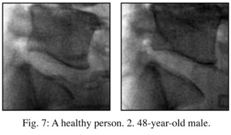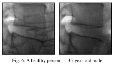 The area of an intervertebral disc space between the fourth and fifth lumbar vertebra of a healthy person 1 without hernia increased by 12% than that before traction(Fig. 6); the area between the fifth lumbar vertebra and the first sacral vertebra of a healthy person 2 increased by 7% than that before traction (Fig. 7). The said areas were measured on the lateral radiogram during traction.