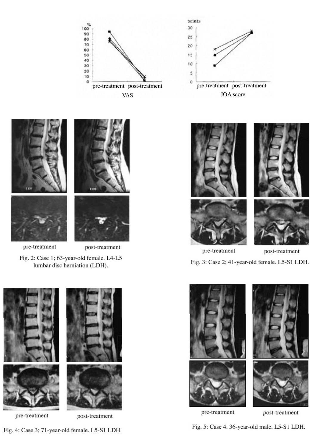 and during these months, physical therapy such as muscle training of the trunk and lower limbs as well as stretching exercise of lower-limb muscles was held once a week. Epidural blocks or NSAlDs was performed along with the said training in some cases. After the completion of the treatment, MRI was held again and morphological changes of LDH were compared with those of MRI before the treatment. In addition. symptom changes between the start of the treatment an’ the completion of the treatment were evaluatk ‘ according to VAS values of pains and Japan Orthopedic Association score (JOA score).