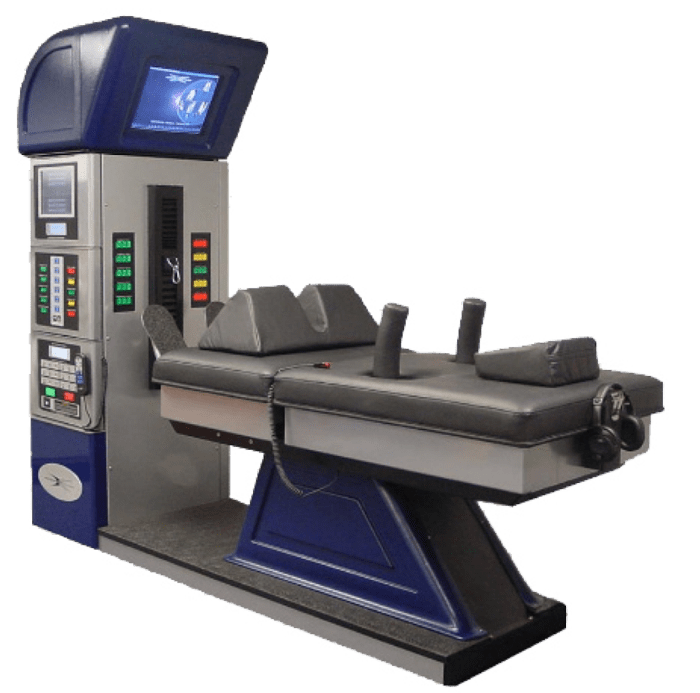 The DRX9000™ applies nonsurgical spinal decompression by using a sensitive computerized feedback mechanism. The DRX9000™ uses a split-table design to reduce friction between the patient and the device. The patient lies supine, and a chest and shoulder support system controls the upper body, with a knee rest to eliminate pelvic rotation. The apparatus has built-in air bladders, disk-angle pull adjustments, and harnesses, and it can increase the decompression force more slowly in the latter part of the therapy. The DRX9000™ spinal decompression device uses a motor pulley to deliver mechanized segmental distraction that can be delivered in a static or oscillatory fashion for a preselected duration; the location of lumbar spinal disease determines the best pullangle settings