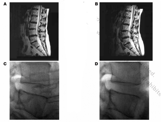 The evolution of technology has led to changes in force application, patient positioning, and the addition of passive restraint systems in the newer nonsurgical spinal decompression devices such as the DRX9000™. Investigators have reported early success with the DRX9000™ system based on objective radiologic observations of intervertebral disk height or measured bulging. In a small series of case studies, a group of investigators added new data to the hypothesis that such decompressive systems can, over time, increase disk volume and reduce herniation, as shown in the MRI findings of a patient (Figures 2A and 2B) and lateral radiograph of an asymptomatic healthy volunteer (Figures 2C and 2D).